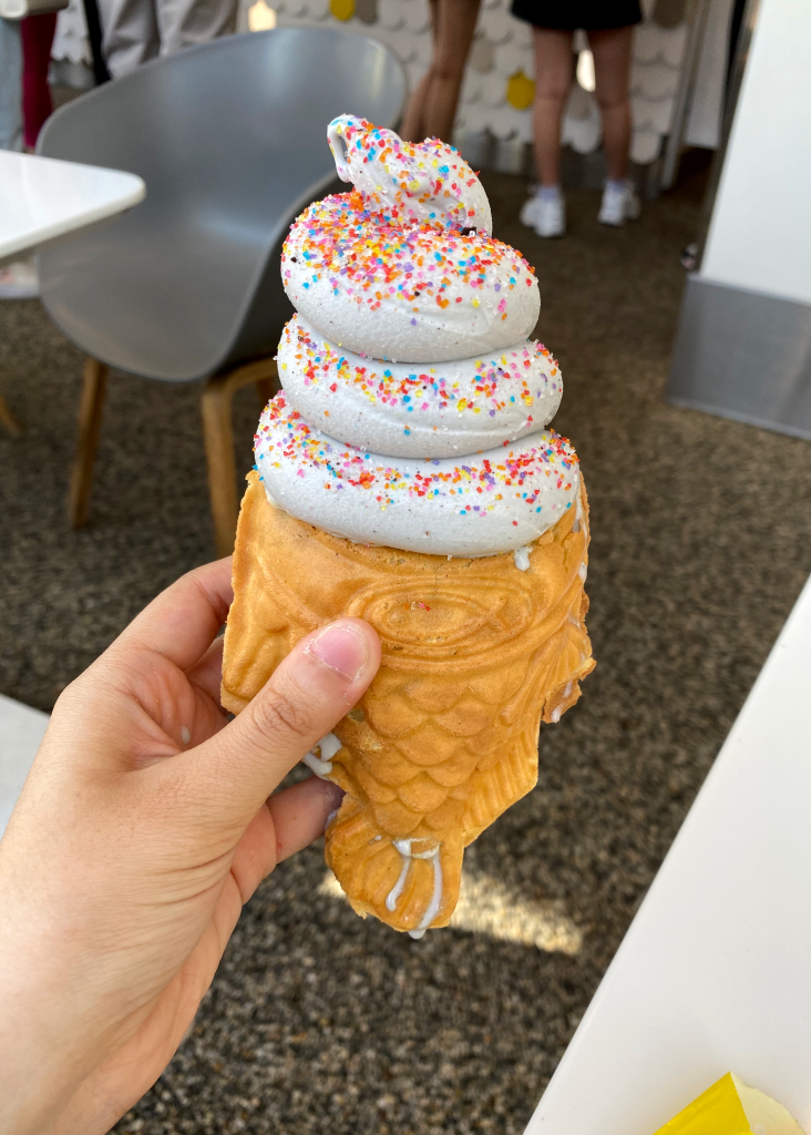 One really cool aspect of this shop is that you get to choose how the fish-shaped waffle cone is presented. In this case, my mom chose hers to be “upside down style,” which resulted in the picture to the left.