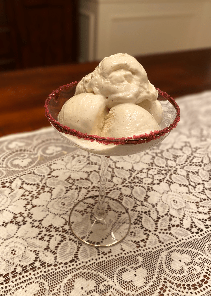 I ended up choosing the glass on the right. I liked it because it was open on top but not too deep, which I thought would keep me from eating too much ice cream. Plus, it was gold rimmed – and that was definitely the vibe we were going for tonight.