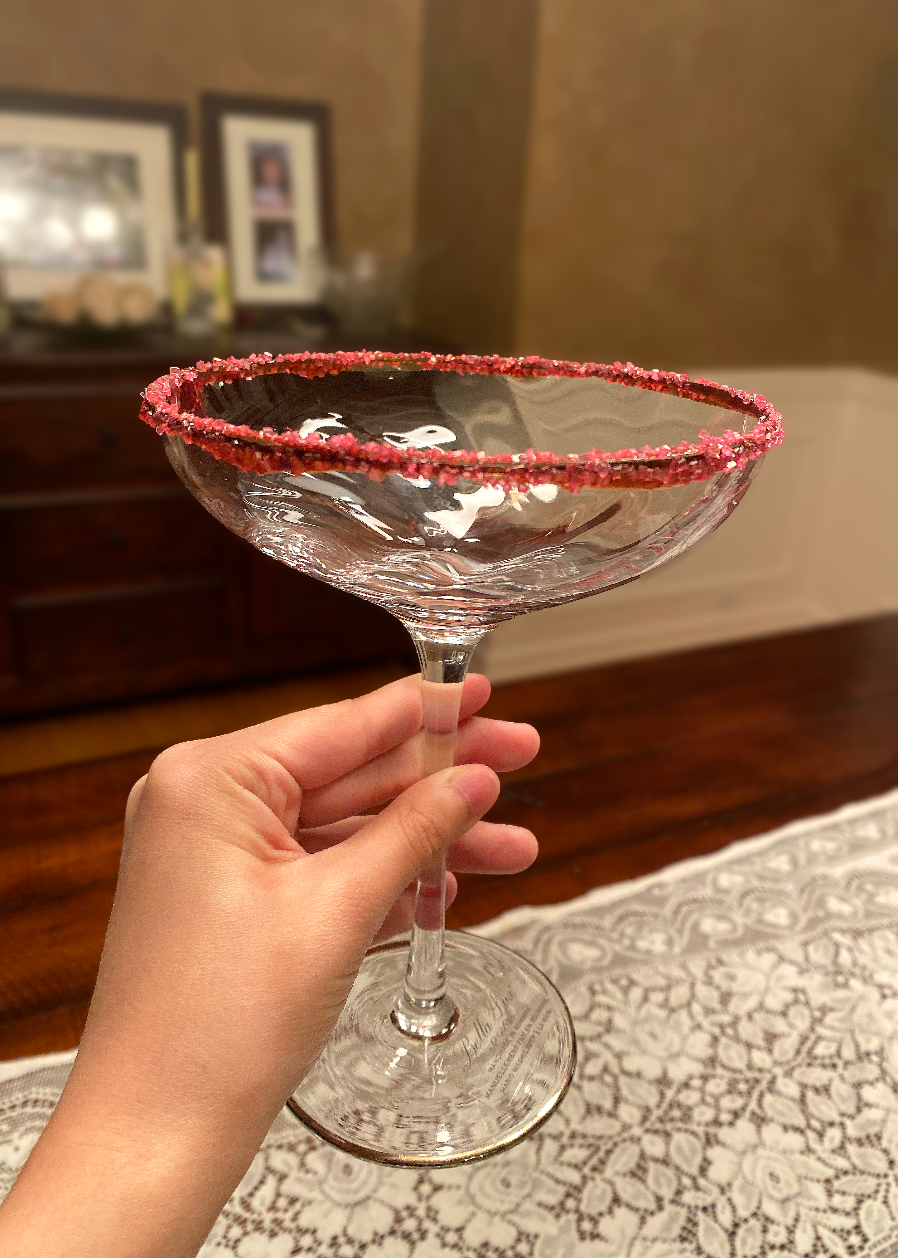 After you have filled your bowls, it’s time to make the sprinkle rim. Begin by tipping the glass upside down into the syrup bowl, coating the rim with the syrup. Then, take your syrup-coated glass and dip it into the sprinkle bowl, twisting the glass around so the sprinkles completely cover the syrup rim.