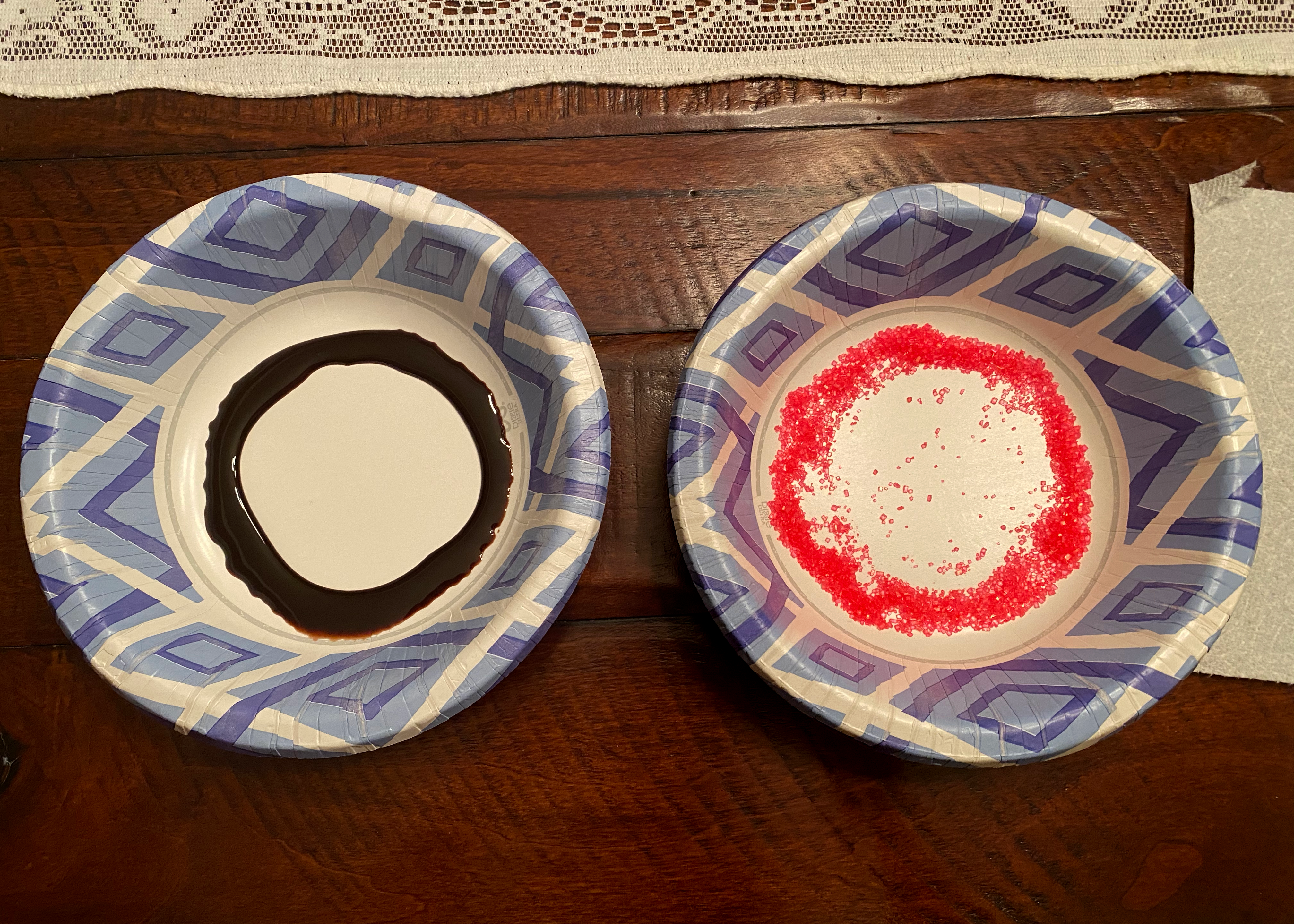 You can completely fill the bowls with syrup and sprinkles if you like, but I didn’t want to waste too much. Instead, I made two circles inside the bowls for the glass’s rim.